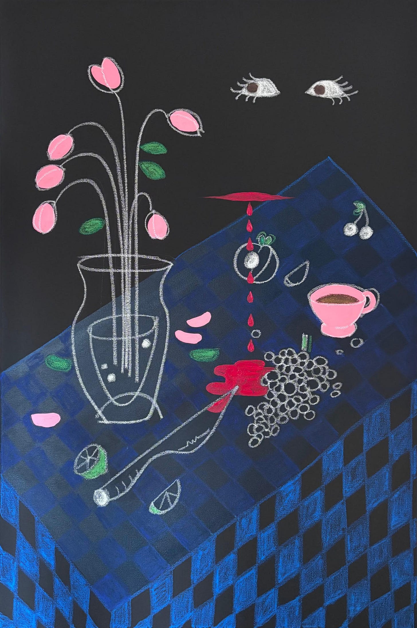 Still life has always served as supporting subject matter—a way for me to experiment with surrealism, perspective, and texture. This piece (which has no title) is a launch point for me on the kind of work I’d like to experiment with moving through the year. I’m having fun, and that’s what matters most.